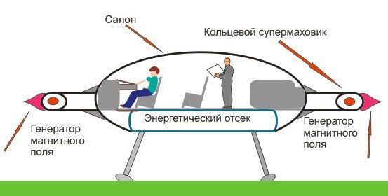 По задумке вращение плазмы должно перенаправить (сместить) вес летательного аппарата в сторону, то.е. на периферию дисковидного крыла. Теоретически вес аппарата должен уменьшится практически до нуля. За счет вращения сверхмаховика создается эффект потери веса и виман становится легче. Далее следует, что вращательное тело сверхмаховика тем самым отсекает летающую тарелку и в частности кабину с экипажем от внешнего гравитационного поля планеты, звезд, галактики. Таким образом для того что бы летающая тарелка взлетела нужно сделать ее легче чем воздух. От скорости вращения этого супермаховика зависит степень отсечения от внешнего гравитационного поля. Чем быстрее будет вращение, тем легче будет становится аппарат. Быстрое вращение приведет к тому, что виман будет висеть над землей на любой высоте от поверхности в состоянии геостационарного спутника. Если же мы сверхмаховик раскрутить еще быстрее то гравитационное поле будет отсечено на 100% и аппарат просто слетит с планеты.Точнее это Земля убежит из под опор корабля с той скоростью с которой она вращается вокруг Солнца. Причем эта скорость будет составлять скорость вращения рукава галактики вокруг оси (центра) галактики. При отсечении внешнего гравитационное поля, автоматически отсекается вся внешняя инерция, и перегрузка. Внутри кабины будет нулевой вес. По этому экипажу вимана не страшны резкие ускорения и остановки. Поэтому НЛО может развивать большую скорость и не снижая скорости совершать повороты под прямым углом или резко останавливаться. Фактически виман будет весить легче воздушного шарика, а для движения и развития большой скорости потребуется совсем немного кинетической энергии производимой электрическими движителями.
