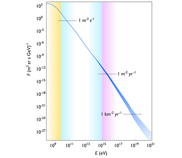 Один из способов классификации космических лучей — по их энергии. На рис. 1 показано распределение частоты лучей в зависимости от энергии (о том, почему график имеет такую форму, рассказано в задаче Степенная зависимость из ничего).