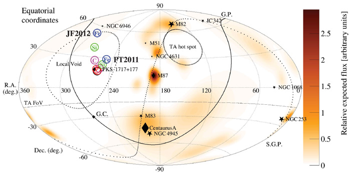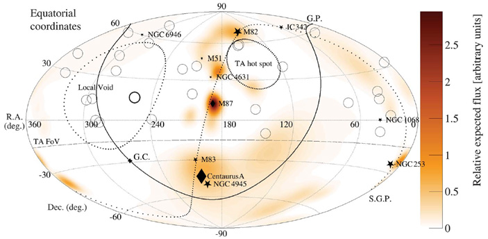 На рис. 5 показано направление прихода этой частицы на небесной сфере. Явно видно, что в том направлении нет какого-либо известного галактического или внегалактического объекта-кандидата, способного породить частицу с такой энергией (в крупномасштабной карте Вселенной там находится локальная пустота). До сих пор в качестве вероятных кандидатов на испускание космических лучей сверхвысоких энергий рассматривались два объекта. Первый — гигантская эллиптическая галактика M 87 с активным ядром в скоплении Девы (удалена от нас на 16,5 Мпк). Второй — активная галактика с интенсивным звездообразованием M 82 (удалена от нас на 3,5 Мпк). Однако обе они располагаются в направлениях, заведомо отличных от тех, что подошли бы в этом случае, и также не совпадают с направлением на избыток космических лучей в созвездии Большой Медведицы, о котором ранее свидетельствовали данные Telescope Array.