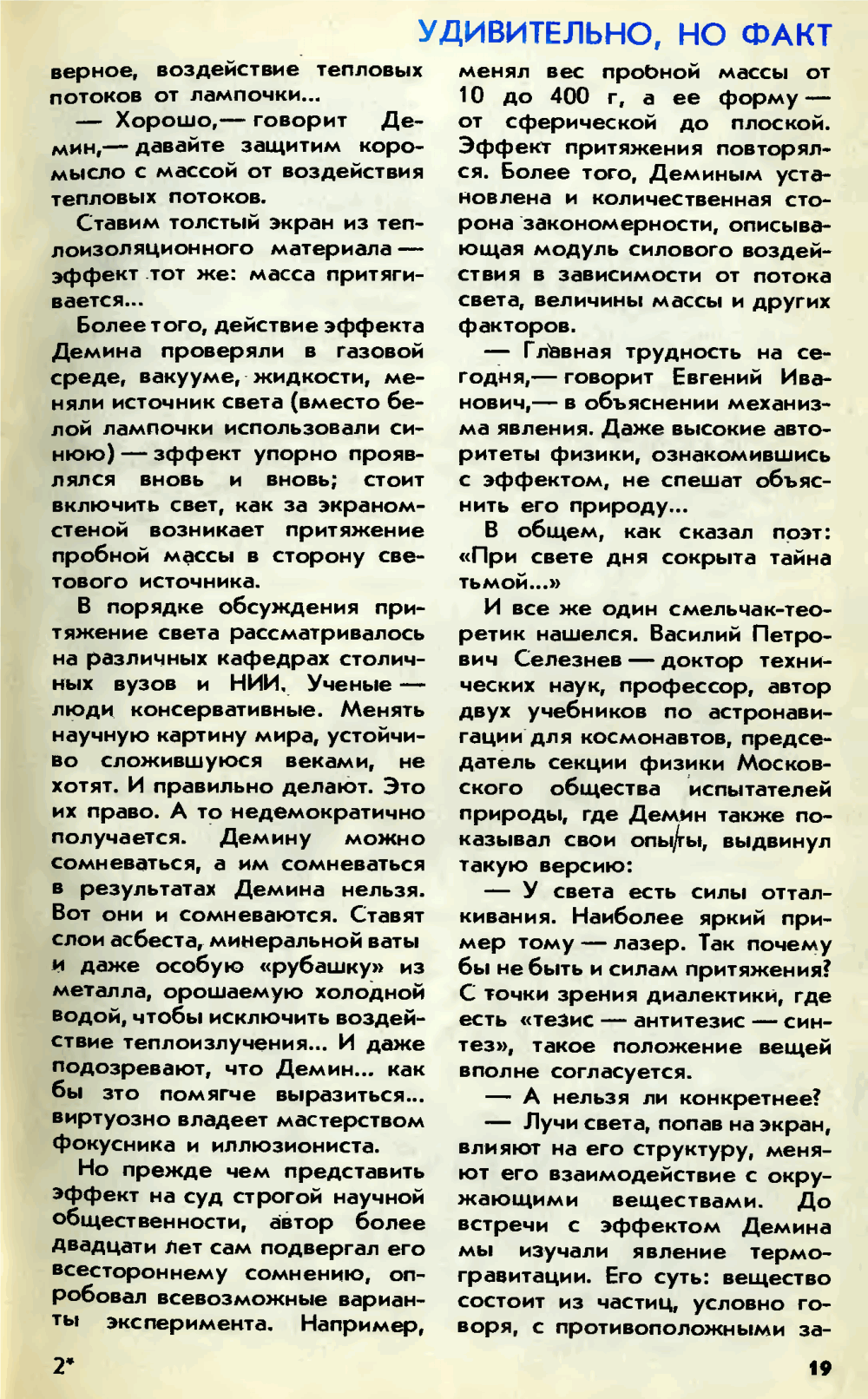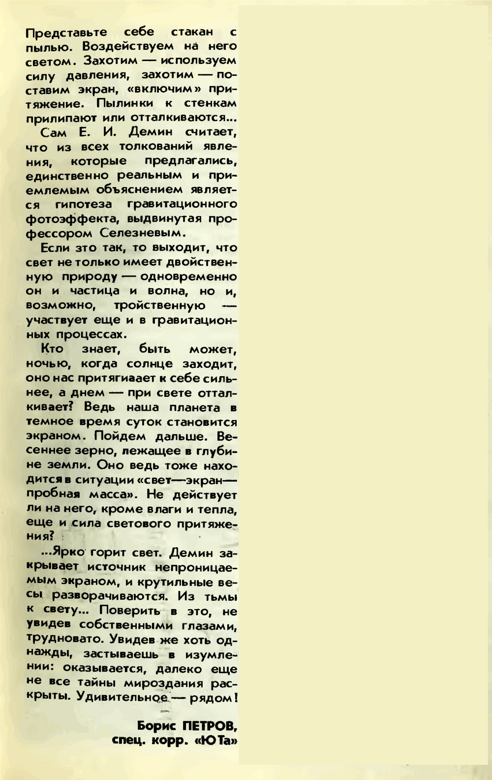 …Откроем учебник физики. Казалось бы, о природе света там сказано все: законы отражения и преломления, явления дифракции, интерференции, поляризации… И конечно, не забыты знаменитые опыты русского ученого П. Н. Лебедева, экспериментально обнаружившего давление света еще в 1900 году. Но вот в 1989 году московский ученый Е. И. Демин подал заявку на открытие, в которой утверждал, что свет обладает не только давлением, но и совершенно до этого неизвестным науке… притяжением…