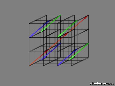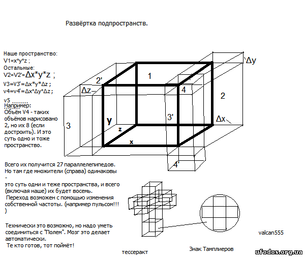 В общем тогда же, т.е. лет 10-12 назад, я построил геометрически ещё 7 измерений. Причём кубов получилось 27, но 8 (с нашим) пространств. В развёртке остальные пространства, как бы, распределены. А между пространствами существует нечто вроде "прослойки". Мне пришлось ввести термин (в эту геометрию, и чисто для себя - пересекающиеся точки - это похоже по смыслу "пересекающиеся прямые в пространстве", но ... 8 точек могут занимать одно и тоже положение если смотреть из более высокого измерения, но они "не видят" друг друга, т.к. эти трёхмерные пространства разные, но содержатся в одном четвёртом измерении. (я не уверен, что это понятно, но это так).