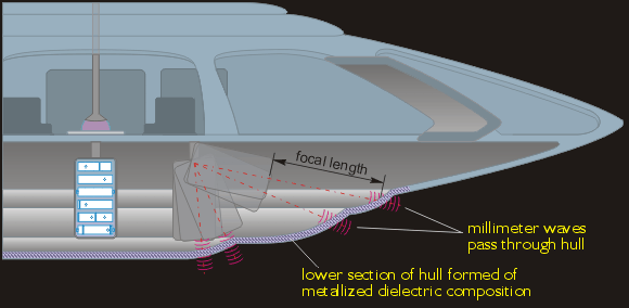 If you look at the figure, above, you will see three sections of the bottom of the hull, each having their own unique curvature. Each of these curved sections are uniquely curved because they have different spacing from the wave generators, resulting in a different “focal length” (to use a photographic term) for the wave propagation. At different focal lengths, the wave’s shape will be different as it enters the dielectric waveguide lens. The resultant wave produced by that lens-waveguide, when that wave passes through it, will also be different. Couple to this the fact that for every different angle that the waves pass through the dielectric hull a different effect of refraction will occur to the wave. Consider next that if this craft uses the two outer generators to focus their two microwave-beams at some finite point in the distance, it would follow that to approach that same point in space, the two beams will have traversed through a different thickness of the dielectric lens, at a different angle, meaning that the two beams will be shaped slightly differently. If, then, it can be controlled how the two waves are shaped, then it will also be possible to control their constructive and destructive interference pattern - and hence the strength or weakness of the electric field at the area where the two beams approach each other. And as you already know the stronger the electric field the stronger the repulsion - the stronger the acceleration.