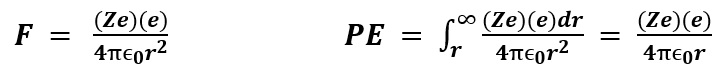The following equations represent the Nuclear Electric Field Force and Potential Energy of an Electron orbiting a Nucleus with Z number of Protons where e represents the electric charge of an Electron or Proton and r represents the Electron distance from the center of the Nucleus:
