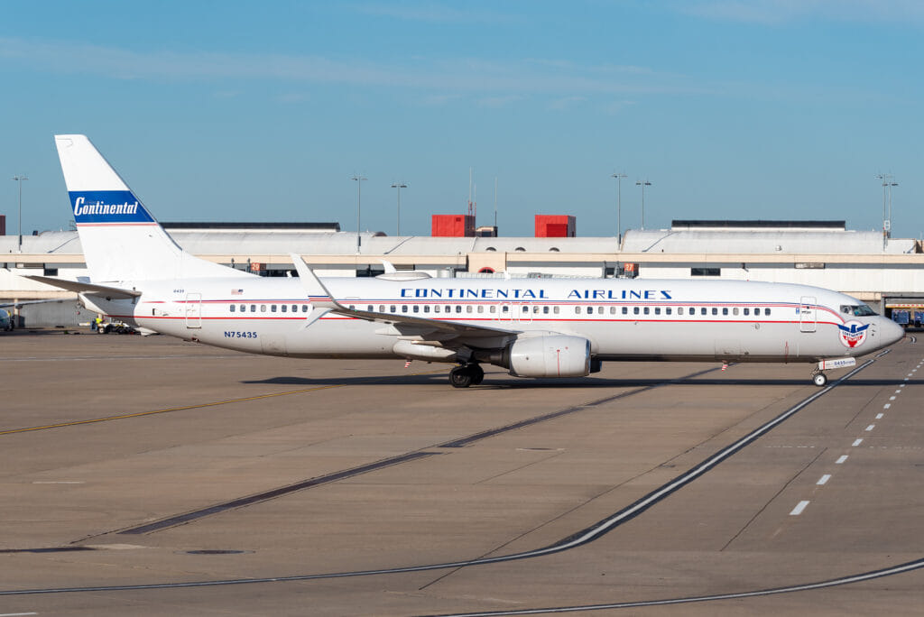 Ретро-самолет United B737-900 в классической ливрее Continental подъезжает к выходу на посадку в аэропорту PIT рейсом из Сан-Франциско.