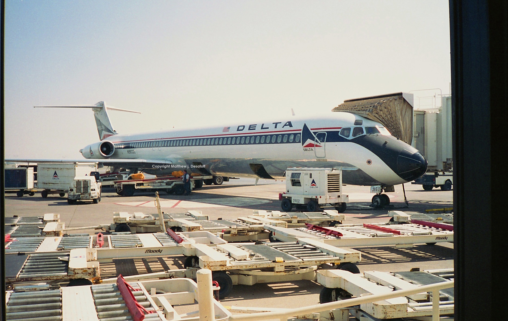 Неудачный снимок самолета Delta Air Lines MD-80, замеченный в ONT (Онтарио, Калифорния) около 1993 года. Плохое освещение и слишком много беспорядка.