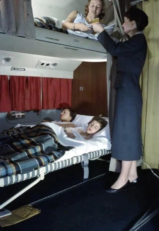 Такие самолеты, как Martin M-130, Lockheed Constellation и Douglas DC-6, эксплуатируемые такими авиакомпаниями, как KLM Royal Dutch Airlines и ныне несуществующей Trans World Airlines (TWA), в то время имели кровати как на верхних, так и на нижних полках. Эти кровати были оснащены матрасами, занавесками в стиле Pullman для уединения, окнами, лампами для чтения и даже услугой завтрака в постель. В то время стоимость билета эконом-класса туда и обратно из Нью-Йорка в Лондон на Boeing 377 Stratocruiser стоила около 580 долларов (около 12 000 долларов сегодня). Багажные полки, какими мы их знаем сегодня, были введены в эксплуатацию в конце 1960-х и начале 1970-х годов.