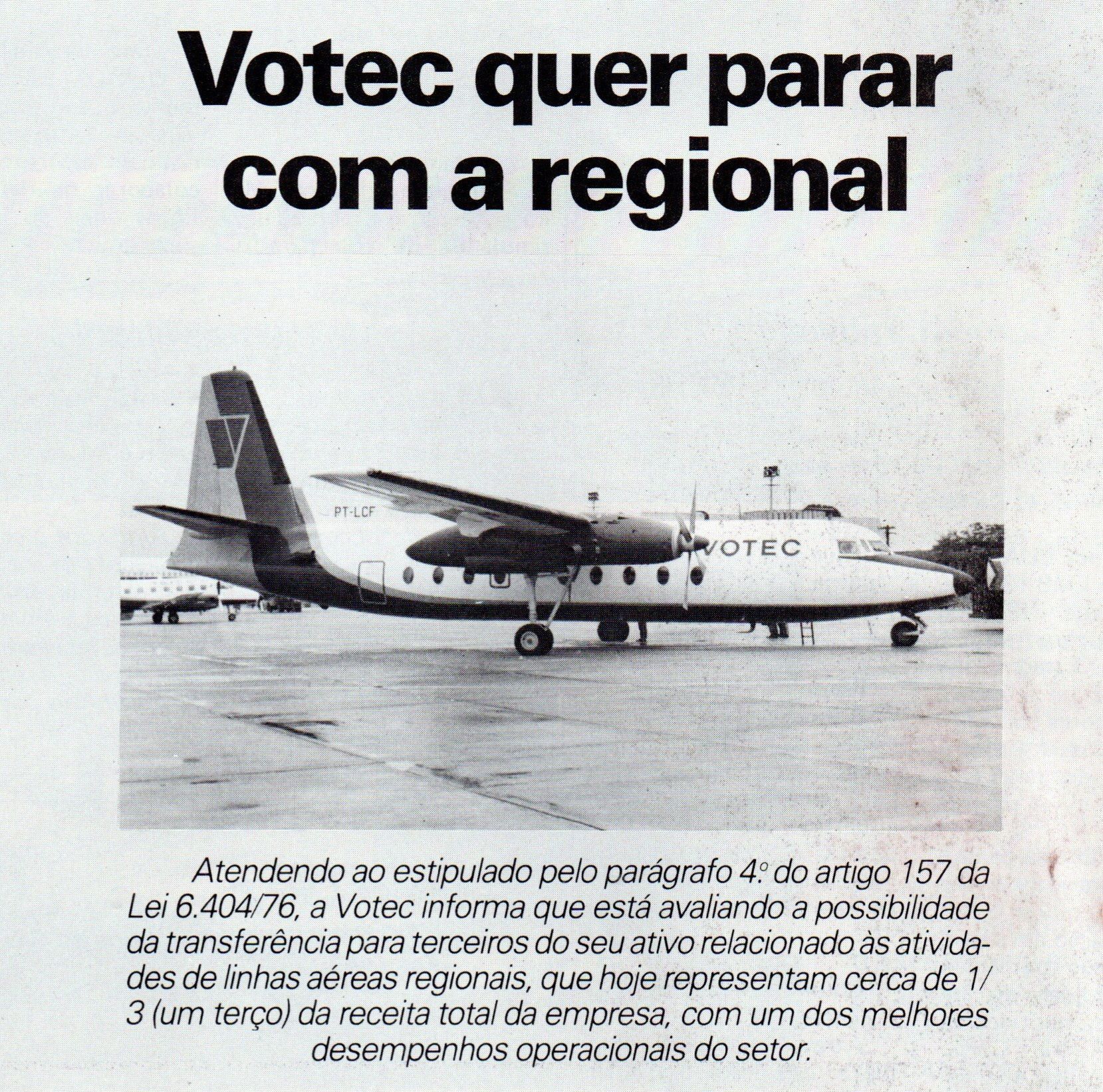 VOTEC, бразильская региональная авиакомпания.. Основанная 12 февраля 1976 года компанией Votec Air Taxi, официально начала свою деятельность 12 октября 1976 года, эксплуатируя самолеты Embraer EMB-110, Fokker 27-200 и Douglas DC 3, обслуживая северные и среднезападные регионы. Она также эксплуатировала несколько других самолетов, таких как Britten Norman BN2A и Mitsubishi MU2 Marquise.