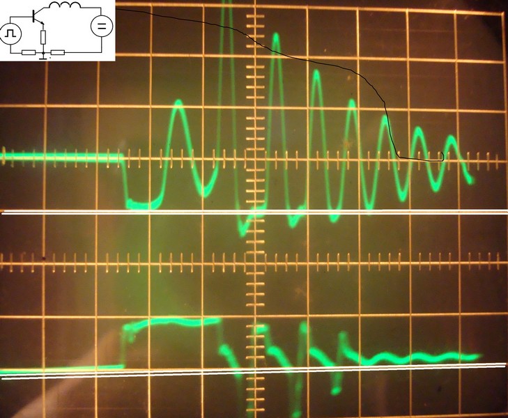 После момента запирания транзистора происходит рассасывание носителей (ток утечки) окончание этого процесса сопровождается импульсом самоиндукции