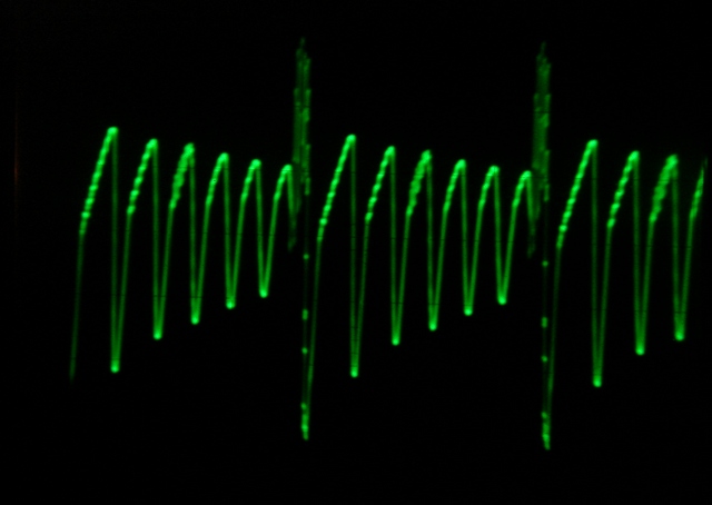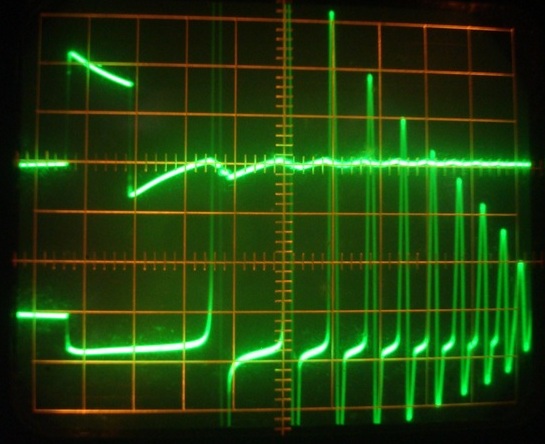 При изменении смещения в базе непрерывный процесс генерации преобразовывался в прерывистый, в виде пачек импульсов. В 1988 г. мной было обнаружено, что сигналы, которые я принимал за блокинг процесс, являются короткими иглообразными импульсами в десятки наносекунд. Я сомневался в наличии взаимоиндукции между базовой и коллекторной индуктивностями, и такую схему я уже не мог называть блокинг генератором.
