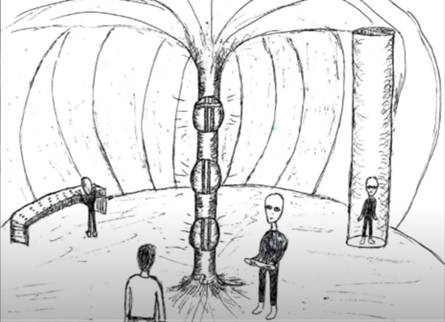 Внутри аппарата, видна колонна-волновод. Можно предположить внизу наличие реактора, на колоннах прозрачные шары со стеклянными парными стержнями внутри. (Вспомним что сообщал Боб Лазар!)