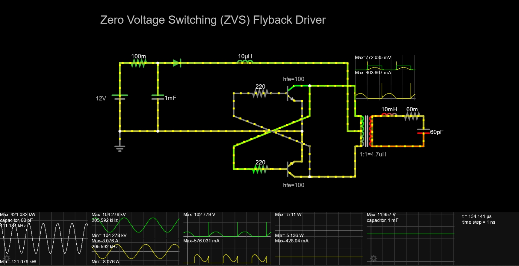 Вот здесь, в симуляторе, я запустил схему, в которой на конденсаторе, как видно, развивается около 400 киловатт мощности. Это соответствует примерно 400 килограммам тяги, если исходить из соотношения 1 грамм = 1 ватт.