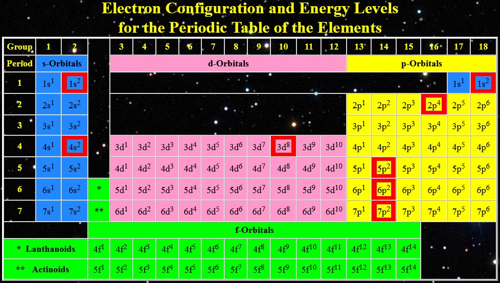 Электроны заполняют электронные энергетические уровни, начиная слева направо вдоль каждого ряда и по рядам сверху вниз. Водород (H) с электронной конфигурацией 1s1 и гелий (He) с электронной конфигурацией 1s2 помещены в верхнюю часть Периодической таблицы с обеих сторон Периодической таблицы элементов, поскольку первый уровень энергии электронов состоит только из «s-орбитали», а Водород может принимать характеристики либо щелочного металла, либо галогена, а гелий — благородного газа.