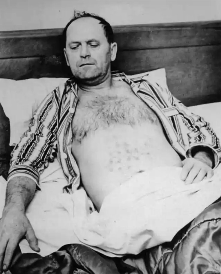 Стефан Михалак с ожогами ниже груди после встречи с НЛО возле озера Фалькон, Канада. фото: howandwhys.com