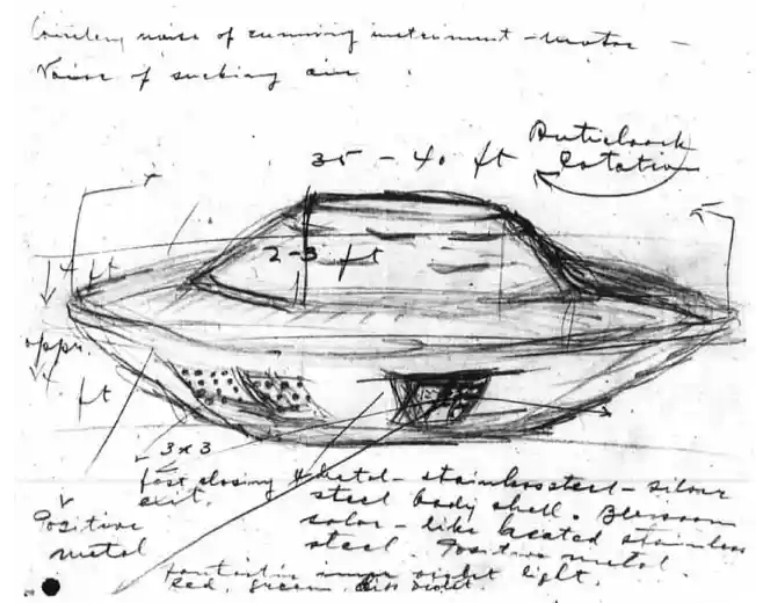 Во всяком случае, он решил проверить это внимательно. Когда он приблизился на 15 метров от объекта, он не только услышал гул и запах серы, но также услышал два человеческих голоса. Исходящих из люка на дне НЛО, который был похож на дверь.