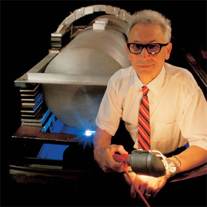 Джозеф Вебер на фоне своего детектора гравитационных волн в бункере Мэрилендского университета. Этот детектор – одна из первых попыток обнаружения гравитационных волн. Сейчас этот массивный цилиндр находится в Смитсоновском музее в Вашингтоне