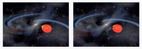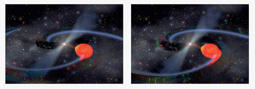 Астрофизики предполагают, что именно излучение гравитационных волн, отбирая энергию, ограничивает скорость вращения массивного пульсара при поглощении вещества соседней звезды.