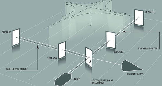 Еще один способ детектирования волн тяготения основан на отказе от массивных резонаторов в пользу световых лучей. Первыми в 1962 году его предложили советские физики Михаил Герценштейн и Владислав Пустовойт, а двумя годами позже и Вебер. В начале 1970-х сотрудник исследовательской лаборатории корпорации Hughes Aircraft Роберт Форвард (в прошлом аспирант Вебера, в дальнейшем весьма известный писатель-фантаст) построил первый такой детектор с вполне приличной чувствительностью. Тогда же профессор Массачусетского технологического института (MIT) Райнер Вайсс выполнил очень глубокий теоретический анализ возможностей регистрации гравитационных волн с помощью оптических методов.