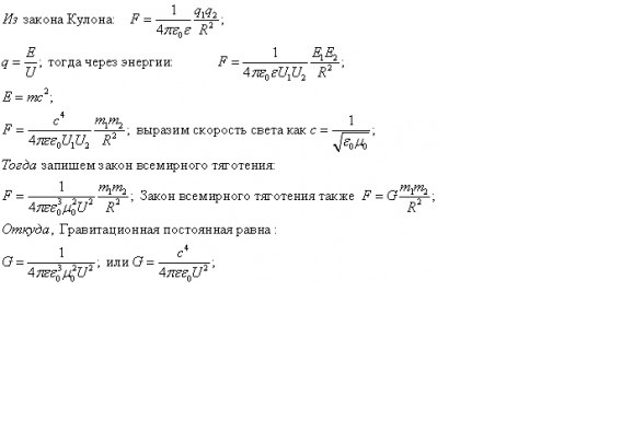 Дело в том, что много лет назад (где-то в 1986м году), по дороге из института я вычислял что есть гравитационная постоянная, но мне не хватило времени в автобусе... Лет через 25 )))) я продолжил, и выяснил следующее (смотрите attachment). Т.е. гравитационная постоянная (исходя из знакомых нам формул) обратно пропорциональна квадрату напряжения, диэлектрической и магнитной проницаемостям.