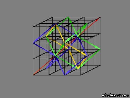 В общем тогда же, т.е. лет 10-12 назад, я построил геометрически ещё 7 измерений. Причём кубов получилось 27, но 8 (с нашим) пространств. В развёртке остальные пространства, как бы, распределены. А между пространствами существует нечто вроде "прослойки". Мне пришлось ввести термин (в эту геометрию, и чисто для себя - пересекающиеся точки - это похоже по смыслу "пересекающиеся прямые в пространстве", но ... 8 точек могут занимать одно и тоже положение если смотреть из более высокого измерения, но они "не видят" друг друга, т.к. эти трёхмерные пространства разные, но содержатся в одном четвёртом измерении. (я не уверен, что это понятно, но это так).