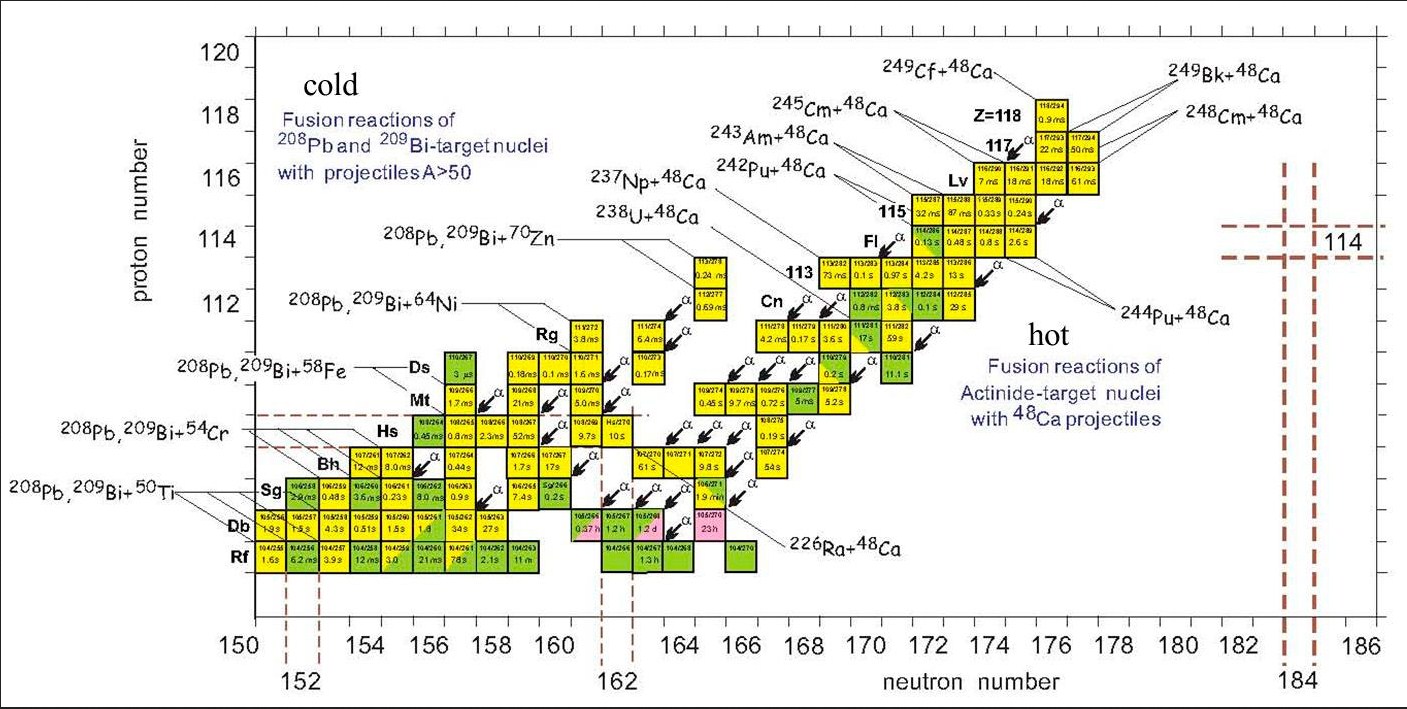 Рис. 2. Карта радионуклидов трансактиноидных элементов, включая некоторые ядерные реакции их получения (взято из [4])