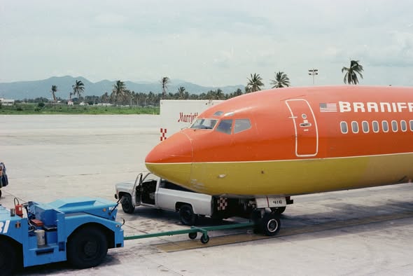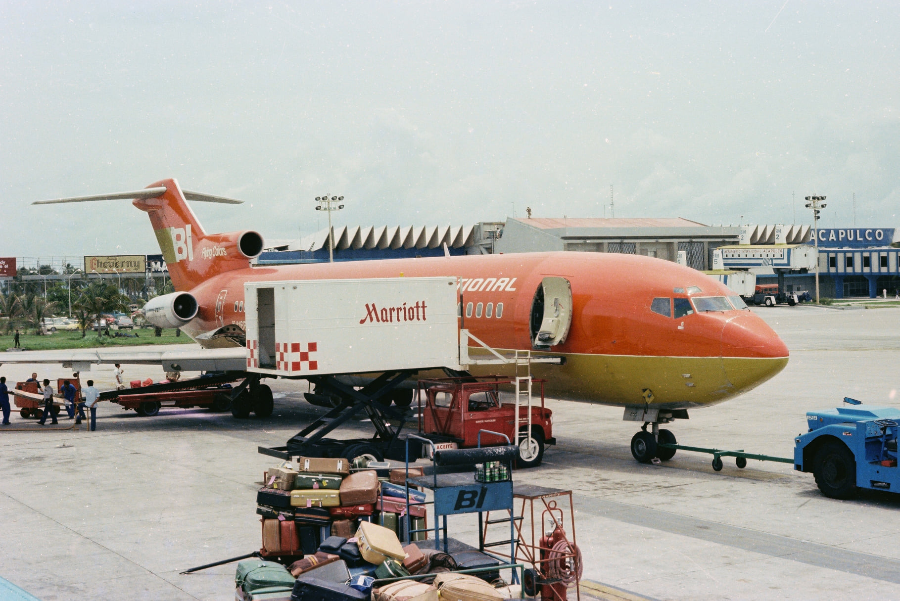 Акапулько послужил фоном для этого самолета Braniff 727-227 (N416BN), соответствующим образом украшенного тропическим оранжевым цветом, когда мы пролетали здесь 15 июля 1978 года. Я был вторым пилотом на прибывающем рейсе, и наш день начался в Миннеаполисе рейсом 81 в IAH и продолжился в ACA.