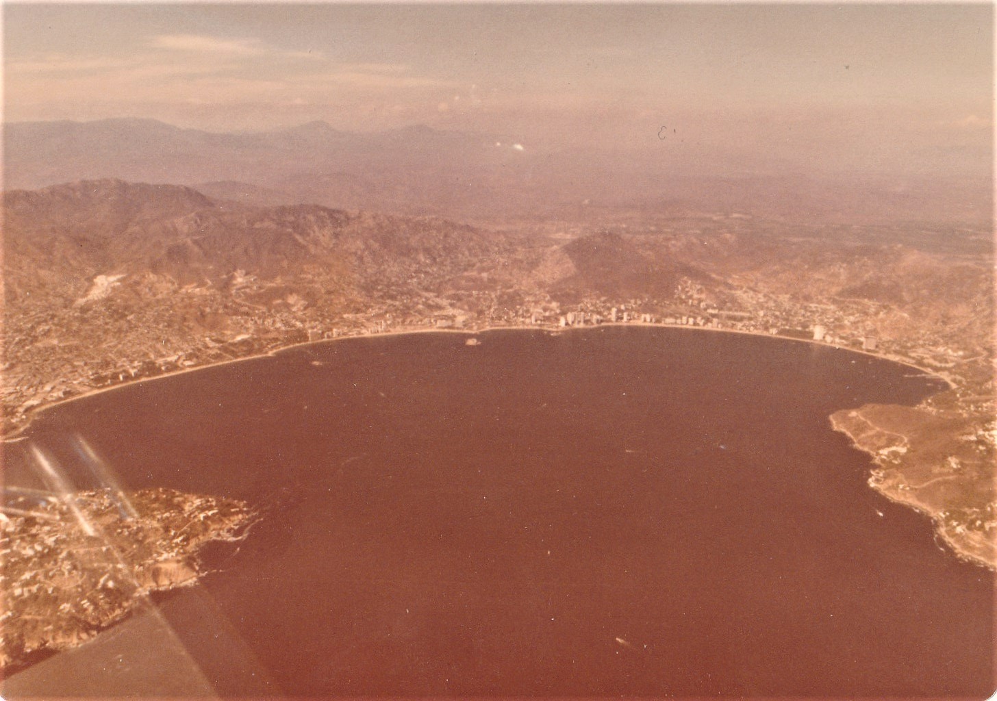 Взлетно-посадочная полоса параллельна пляжу, а примерно в 10 милях находится залив Акапулько. Мы обычно запрашивали «Вылет из залива», это был живописный облет туристического места, чтобы пассажиры могли полюбоваться с высоты птичьего полета на то, как они отдыхали. Это всегда одобрялось, когда была хорошая погода (что обычно и было) и мало машин (что обычно и было). Вот выцветший снимок, показывающий вид из кабины пилота на борту «Bay Departure».