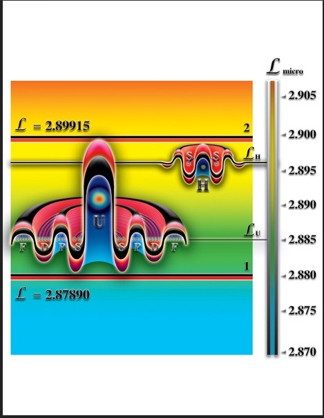 - Рис.3.3.5. Сопоставление степени влияния на окружающий микрокосмос (микропространство) атома водорода H и атома урана U. Собственный уровень мерности урана U позволяет ему быть устойчивым в пределах незначительного диапазона мерности. Именно поэтому уран и все трансурановые элементы радиоактивны, т.е., неустойчивы, практически, при любых условиях. В то время, как водород и другие лёгкие элементы, становятся неустойчивыми только в определённых условиях. Чем легче элемент, тем он более устойчив, а это означает, что необходимо большее внешнее воздействие, чтобы вызвать его неустойчивость.
