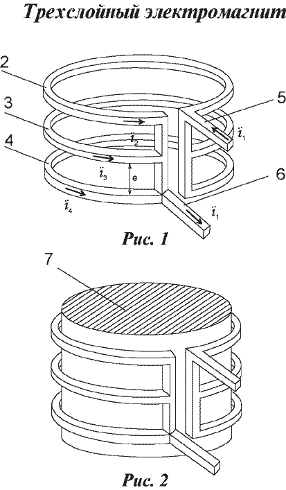 Целесообразно, чтобы электромагниты были выполнены с использованием сердечников из магнитострикционного материала, что значительно увеличивает плотность энергии продольной волны, создаваемой многослойным электромагнитом. На Рис.2 показан вариант выполнения излучателя с сердечником. В случае применения высокочастотных ферромагнитных магнитострикционных материалов 6 эффективность работы излучателя значительно возрастает.