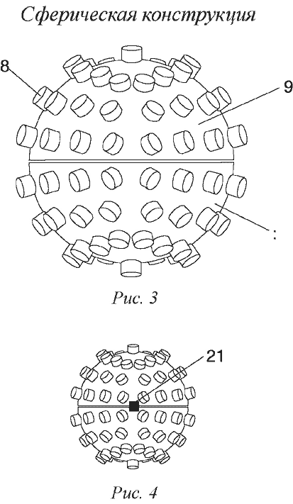 На Рис.3 показано сферическое размещение излучателей 7 на верхней 8 и нижней 9 полусферах корпуса, который может открываться для размещения внутри него датчиков, различных объектов и изучения влияния изменений плотности энергии пространства на свойства различных материалов, скорость протекания физических и биологических процессов, а также химических реакций. На Рис.4 показано расположения датчиков 10 внутри устройства.