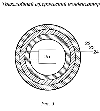 В другом варианте реализации устройства на Рис.5 показан вариант воплощения предлагаемого способа в виде сферического электрического конденсатора с тремя обкладками 11, 12 и 13, каждая из которых подключается к выходу трехфазного генератора импульсов 14.