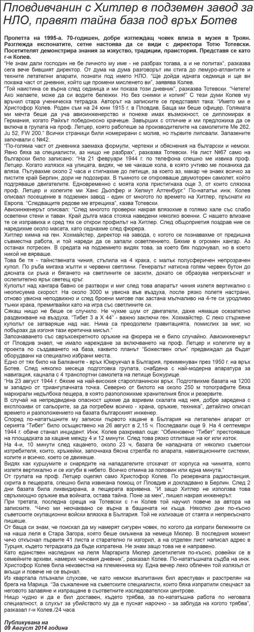 Прилагаю статью о болгарском специалисте, который работал вместе с немецкими специалистами и присутствовал на демонстрации неконвенционального летательного аппарата в 1944 году.