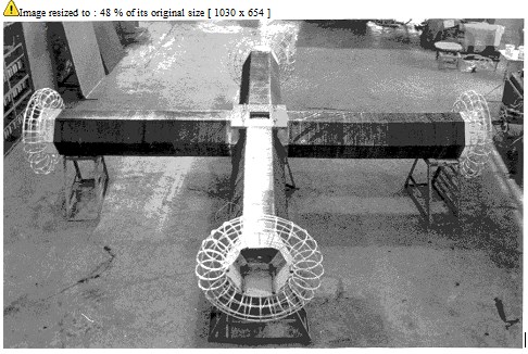 Возможны другие варианты расположения и запитки возбудителя, в частности, с радиальным расположением и расположением по кругу (аналогии запитки треугольником и звездой) с соответствующей запиткой и шагом h=2PI/N. Считая, что сегодня наличие эфира определено и его свойствами можно пользоваться для доказательства решаемой задачи, можно оперировать его движением под действием созданного поля и проводить аналогии с движением жидкости или газа с абсолютно упругими свойствами. В этом случае возбуждаются электрическое и магнитное поля, образуя реакцию силой F=P/c, заставляющей двигаться эфир. Но поток энергии, создаваемый одним фрагментом возбудителя, уравновешивается количеством входящего и выходящего эфира. В итоге на возбудитель действуют силы F0 и -F0, взаимно компенсирующие друг друга. Для их раскомпенсации необходимо ввести ассимметрию. Второй фрагмент возбудителя обеспечит вторую пару сил с другой геометрией, другим направлением вращения и другой рабочей частотой. В частности, если взять два фрагмента, соосно расположенных на расстоянии h друг от друга, с разными диаметрами, но с одинаковыми P, то за счет сохранения количества движения эфир образуется ассимметрично и появляется результирующая сила тяги. В настоящее время отработан третий макет фрагмента двигателя "Пондеролет" (рис.1) и в лабораторных условиях на стенде определены его основные технические параметры. Так получены характеристики электрического и магнитного полей на частоте 80кГц при подводимой к одному плечу мощности 10кВт. В ближайшее время будут начаты испытания по оценке пондеромоторного эффекта фрагмента "Пондеролета" над поверхностью земли: вращающий момент, взаимодействие одного возбудителя с зеркальным отражением в земле и т.д. Начато проектирование натурального фрагмента "Пондеролета" с R=40m, обеспечивающим P ок. 1014 и FT ок. 3х104Н.