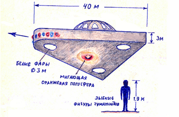 Каков же он, наш гость? Размеры его весьма внушительны, даже по нашим меркам XX века. Большинство очевидцев утверждают, что размеры НЛО 35-60 метров, хотя эти данные в рассказах колеблются от 15 до 500 метров. Венчает треугольник находящееся на крыше аппарата странное сооружение, напоминающее "птичью клетку", внизу на плоском днище находятся три светящиеся шара диаметром около пяти метров, цвет их может быть любым (в зависимости от режима полета), обычно — красный или белый.