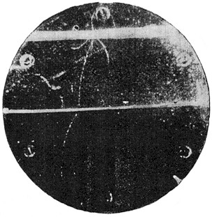 Большая часть следов, попавших на фотографии, судя по знаку их кривизны, очевидно, обязана своим происхождением отрицательным электронам. Но обнаружено немало и таких случаев, когда следы, имея один конец либо в самом свинцовом экранчике, либо поблизости от него, обладают кривизной противоположного знака. Одно из двух: или эти следы принадлежат частицам, несущим положительный заряд, или − отрицательным электронам, испущенным из разных отдаленных углов камеры и как-то так удачно собирающимся магнитным полем, что их следы заканчиваются как раз на свинцовой пластинке. С точки зрения статистики, конечно, гораздо более вероятен первый вариант объяснения, т.е. что следы начинаются в экранчике и, следовательно, прочерчены частицами, несущими положительный заряд.