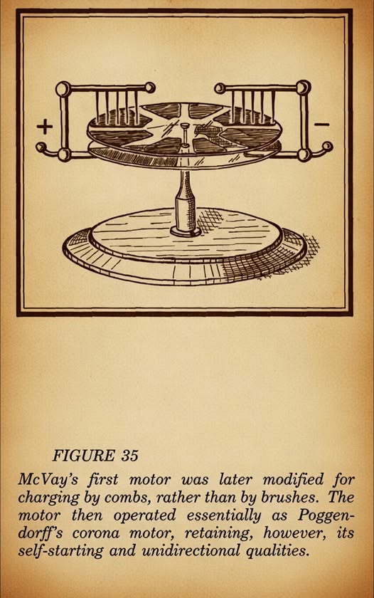 Johann Christian Poggendorff invented the corona motor around 1869, initially with a glass disk rotor between angled combs for charge transfer. The figure shows an early modification of McVey’s pioneer motor, replacing brushes with corona principles for brushless operation.