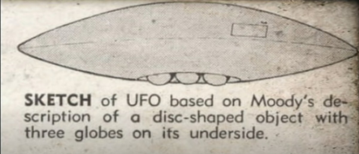 Затем он начал медленно и неуклонно приближаться к Муди. Он запрыгнул в машину, но не смог её завести. НЛО остановился примерно в двадцати метрах от него. Муди услышал высокий жужжащий звук. Он заметил прямоугольное окно в аппарате, через которое виднелись тени, напоминающие человеческие фигуры. Шум прекратился, и он почувствовал, как по его телу пробегает дрожь.