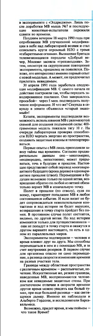 Иными словами, МВ воздействует не только на свою внутреннюю часть, не только на полезную нагрузку, но и на окружающую среду. Очень напоминает реактивный способ движения, только уже не в Пространстве, а во Времени: полет посредством отброса назад не массы, а Времени».